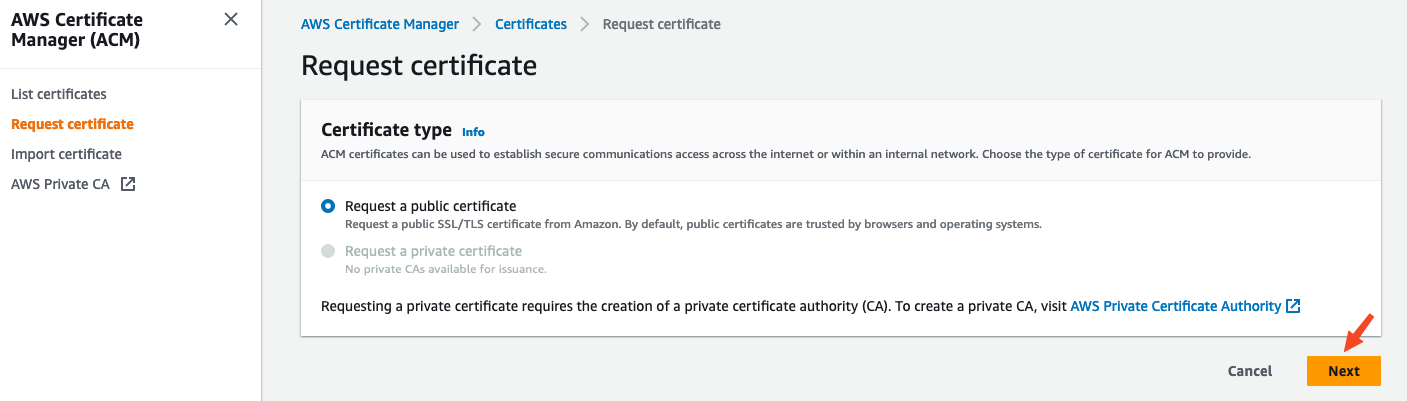 $ CERT_ARN=`aws acm list-certificates --query 'CertificateSummaryList[].CertificateArn[]' --output text`