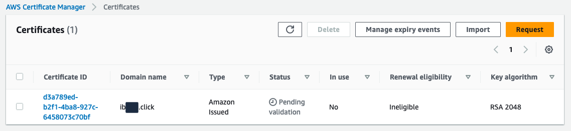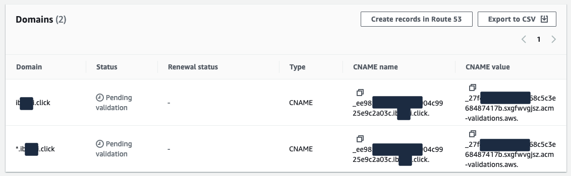 인증서를 생성한 후에는 Pending validation 상태인 것을 볼수있고, acm 상세 페이지에서 인증을 위한 레코드를 확인할 수 있습니다.