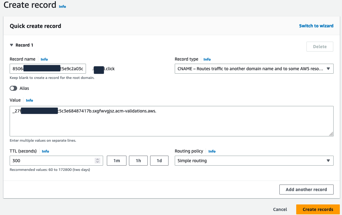 해당 레코드를 Route53 hosted zone에 등록하면 인증이 완료됩니다.