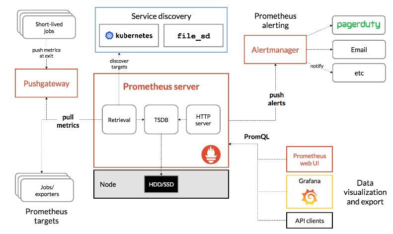 exporter를 타겟에 설정하고 service discovery를 통해 해당 타켓을 찾고 metric을 수집합니다.
