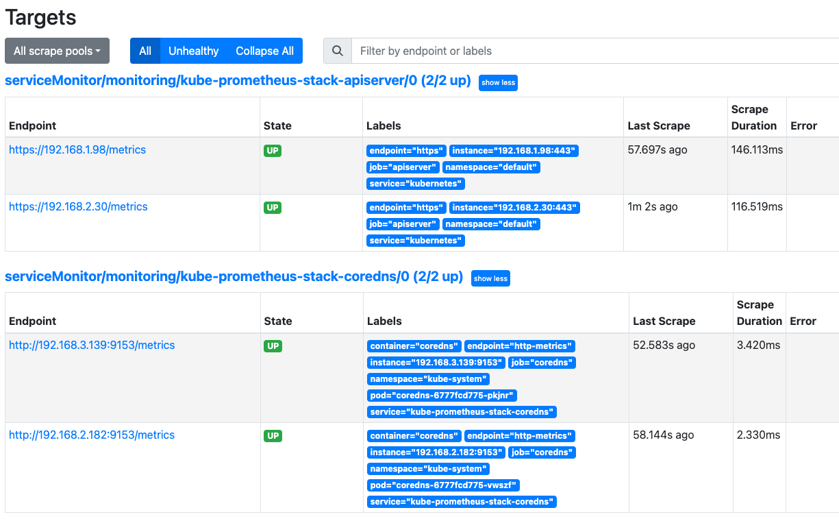 타겟에는 api-server와 node에서 제공하는 메트릭이 포함되어 있습니다.