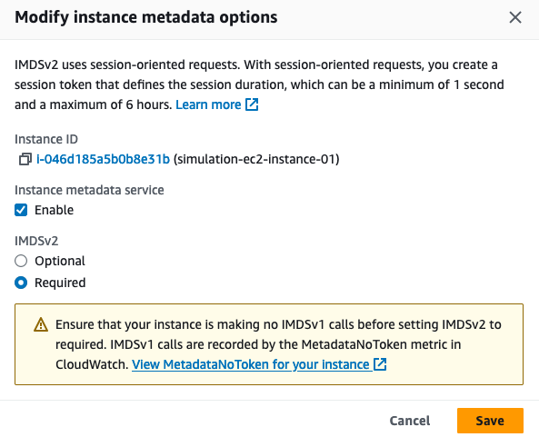 해당 취약점이 IMDSv1을 사용하여 발생하는 것이기 때문에, 이번에는 EC2의 설정을 IMDSv2만 사용하게 바꿔보겠습니다.