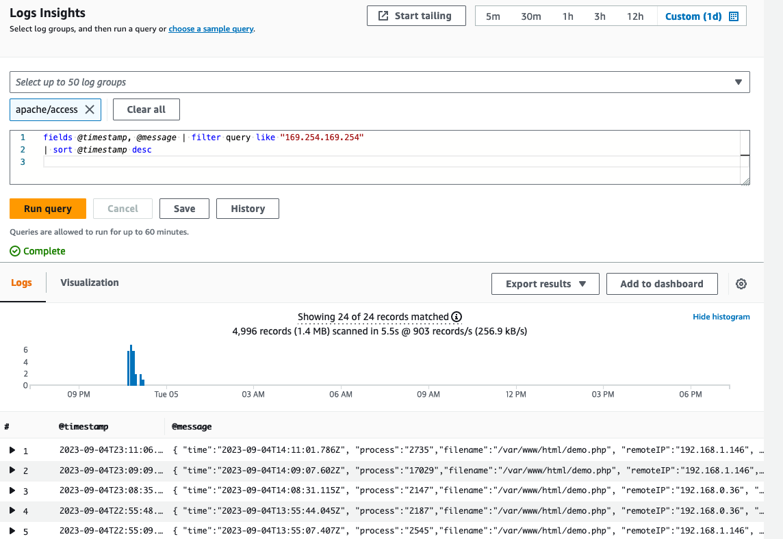 CloudWatch loggroup을 선택하고 쿼리를 실행하면 아래와 같은 결과를 얻을 수 있습니다.
