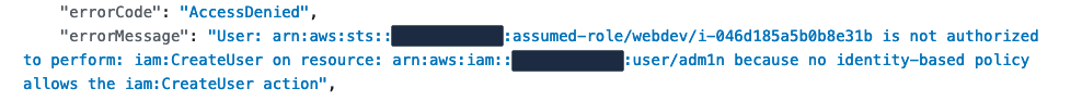 An error occurred (AccessDenied) when calling the CreateUser operation: User: arn:aws:sts::111122223333:assumed-role/webdev/i-046d185a5b0b8e31b is not authorized to perform: iam:CreateUser on resource: arn:aws:iam::111122223333:user/adm1n because no identity-based policy allows the iam:CreateUser action