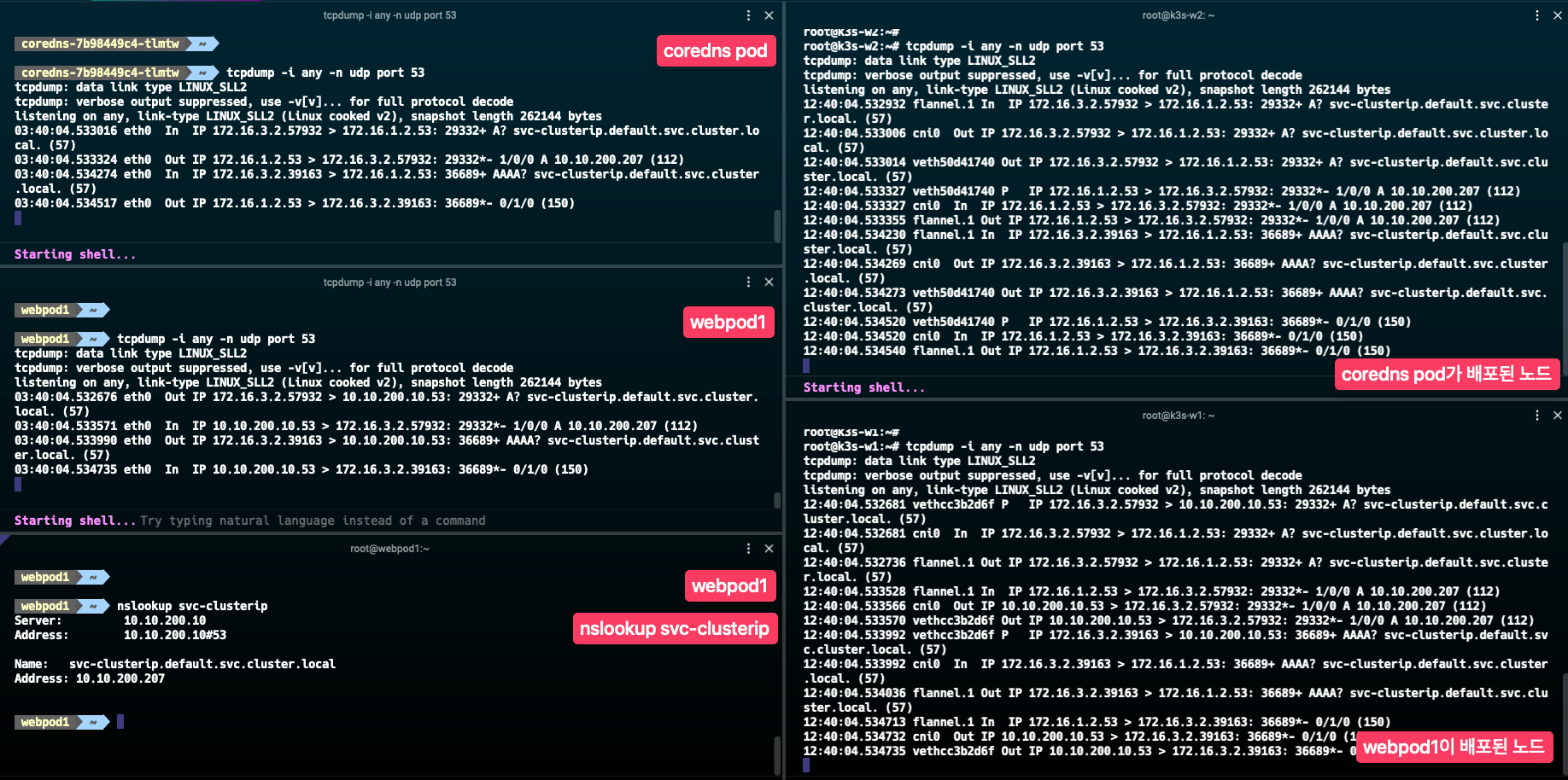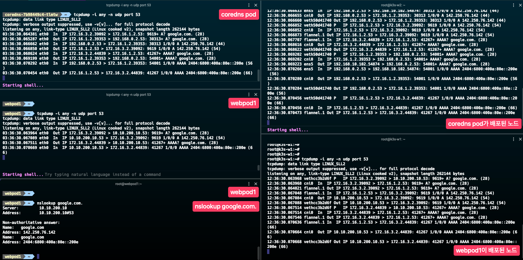 webpod1에서 nslookup 실행 시 coredns 파드에 요청이 전달되고, coredns 파드에서는 /etc/resolv.conf에 설정된 nameserver 192.168.0.2에 질의를 하는 것을 확인할 수 있습니다. 해당 통신은 coredns 파드가 배포된 노드에서도 확인할 수 있습니다.