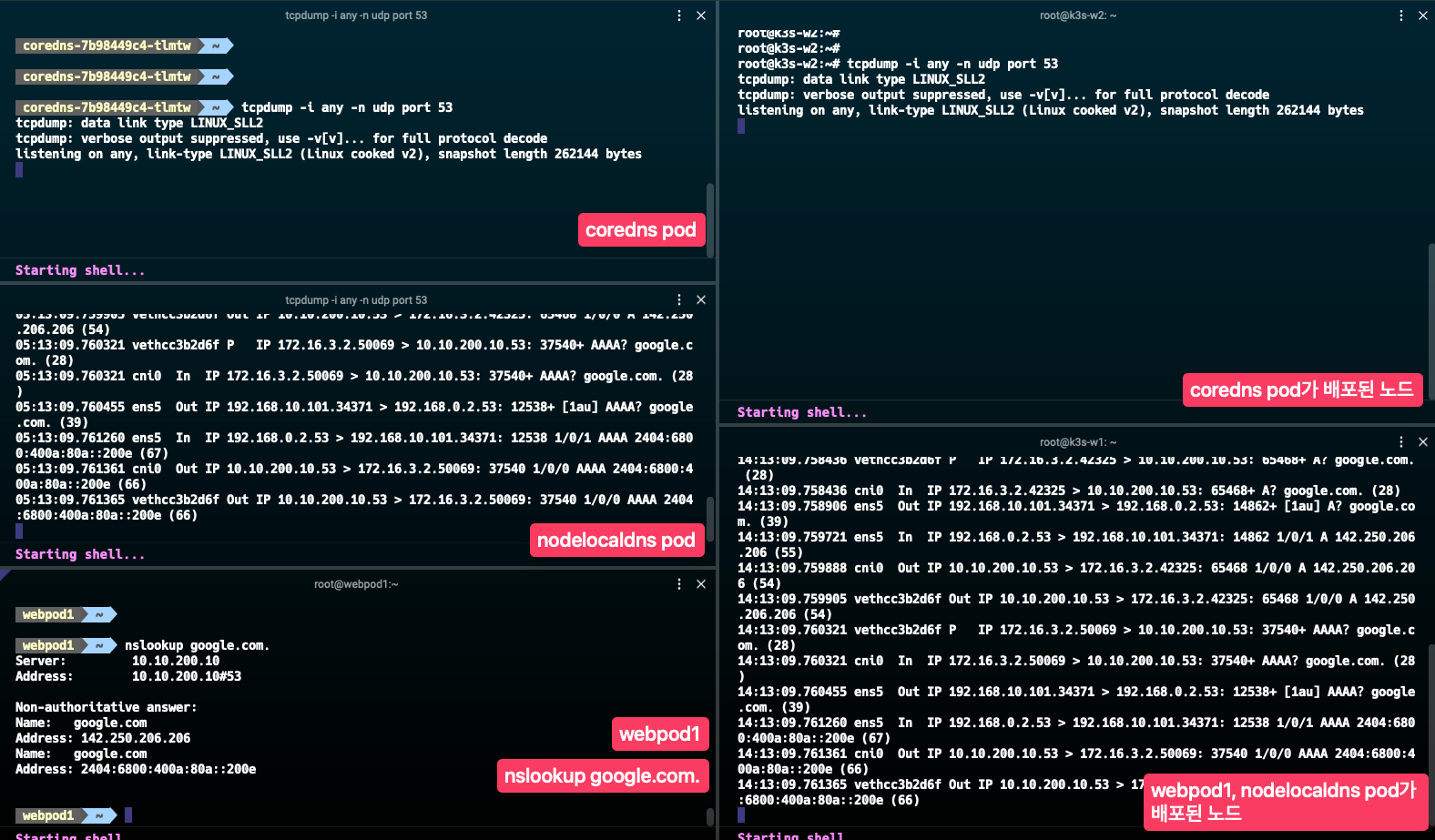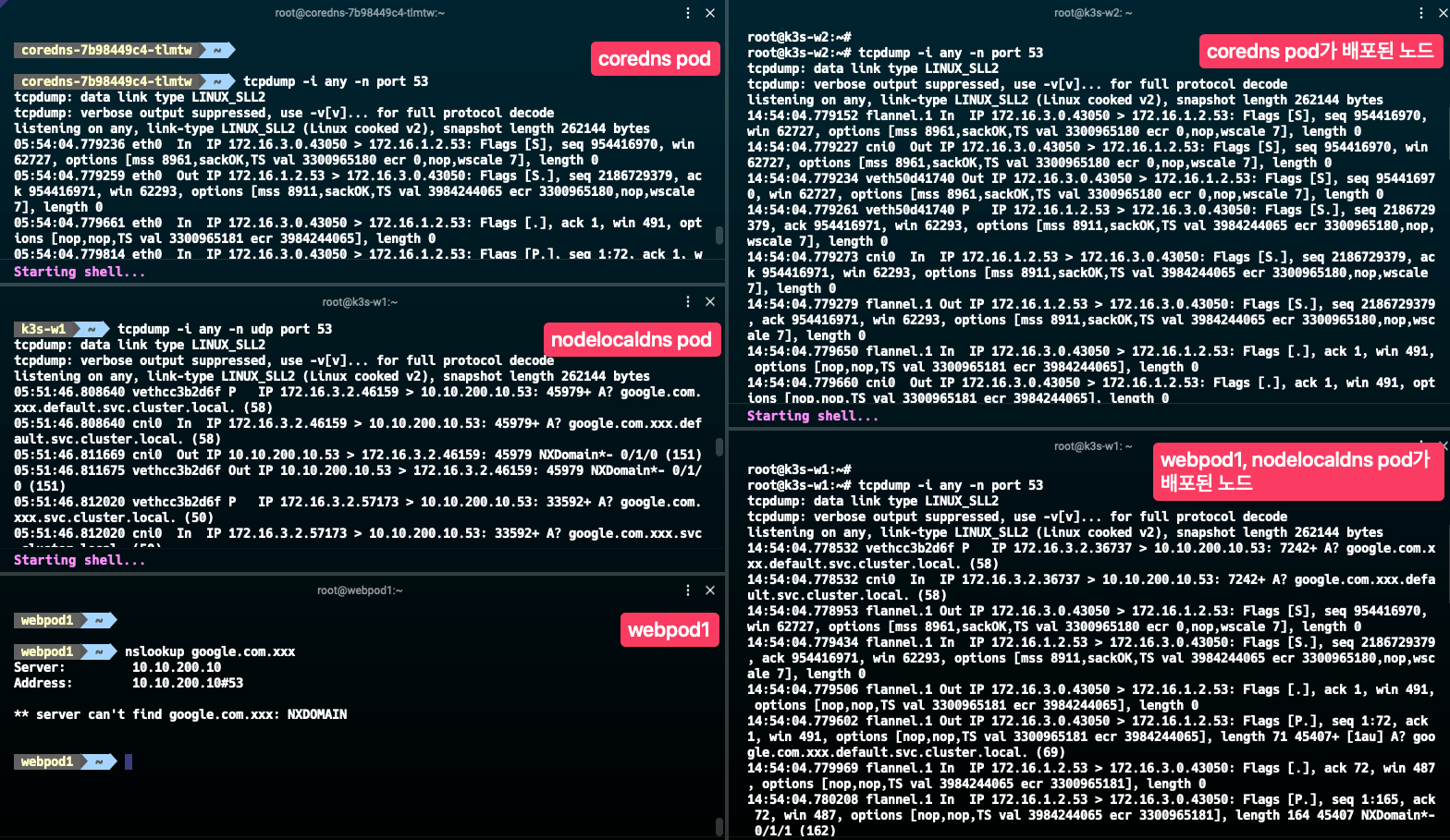 webpod에서 google.com.으로 질의를 하면, CoreDNS 파드를 거치지 않고 node-local-dns 파드에서 처리되는 것을 확인할 수 있습니다.