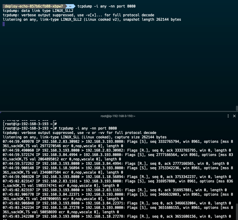 이를 통해 노드를 거쳐서 iptables에 의해 파드로 다시 포워딩되는 것을 확인할 수 있습니다.