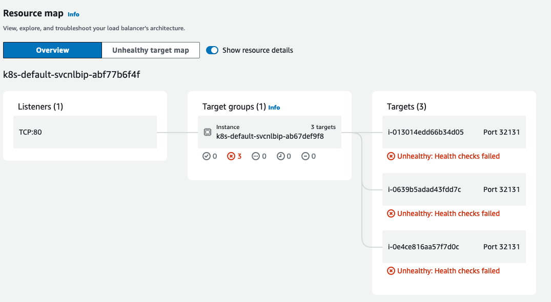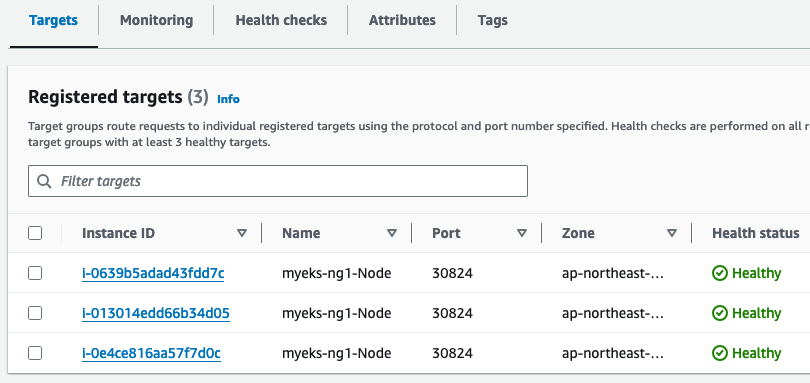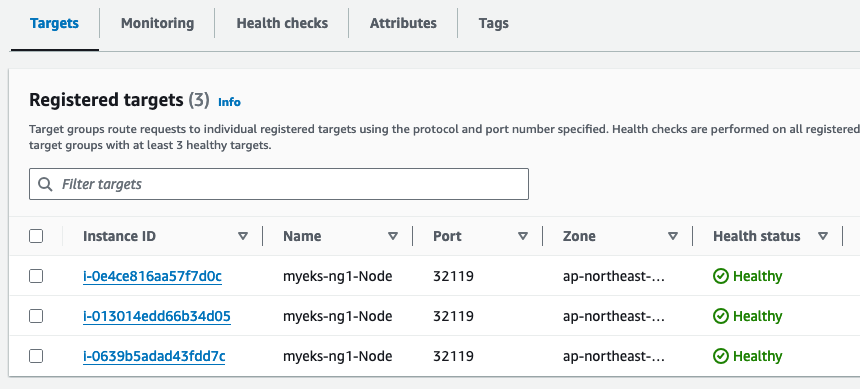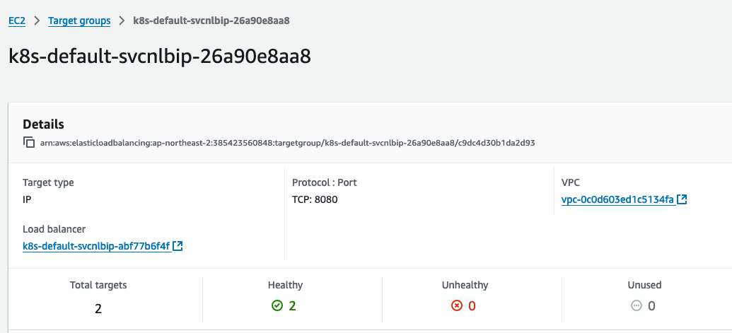 TargetGroup을 확인해보면, Service Type이 NodePort이지만, 파드의 ip와 port로 등록된 것을 볼 수 있습니다.