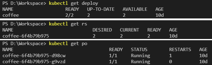 - Deployment 생성 시 ReplicaSet이 같이 생성되며, Pod명은 {ReplicaSet명}-{변수}의 형태를 갖음