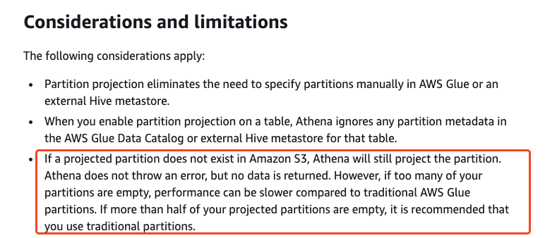 지난 글에서 사용한 partition projection 방식에서 개선 필요한 점이 있어, 2탄을 작성합니다. Athena로 S3에 저장된 VPC flow logs 조회하기VPC flow logs를 Athena로 조회하기 위한 설정 방법을 소개합니다. VPC flow logs 설정 VPC flow logs를 S3에 저장할 때의 주요 설정 항목은 아래와 같습니다. 1.Log record format VPC flow logs에 포함될 필드를 저장합popappend.tistory.com Partition Projection을 사용하며 발견한 이슈기존에 아래와 같이 partition projection을 사용한 DDL문을 사용하여 테이블을 생성한 뒤, 해당 테이블에 대해 쿼리를 실행했을 때, WHERE절에 a..
